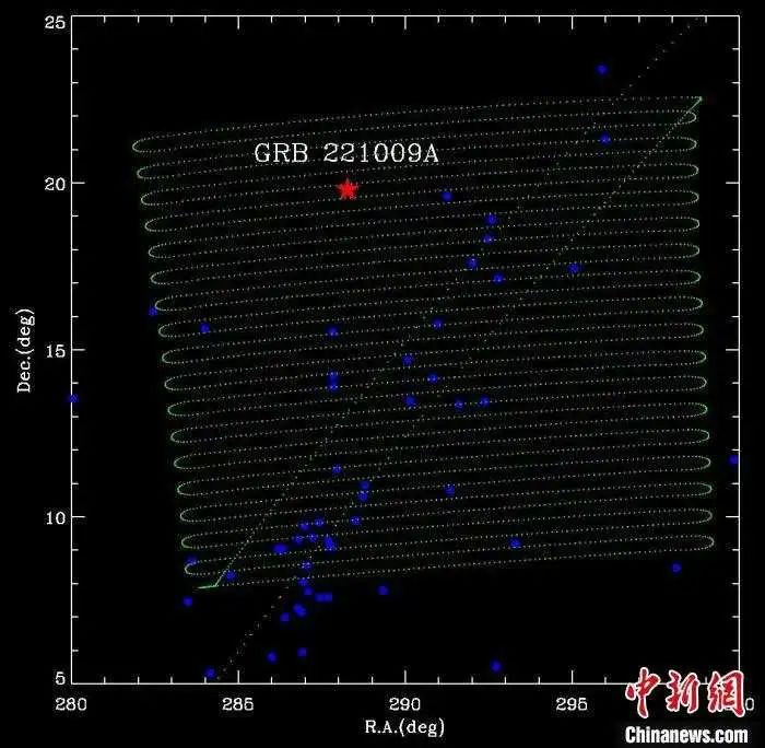 “慧眼”卫星观测迄今最亮的伽马射线暴GRB 221009A,绿色点线代表望远镜指向的扫描轨迹。中科院高能所 供图